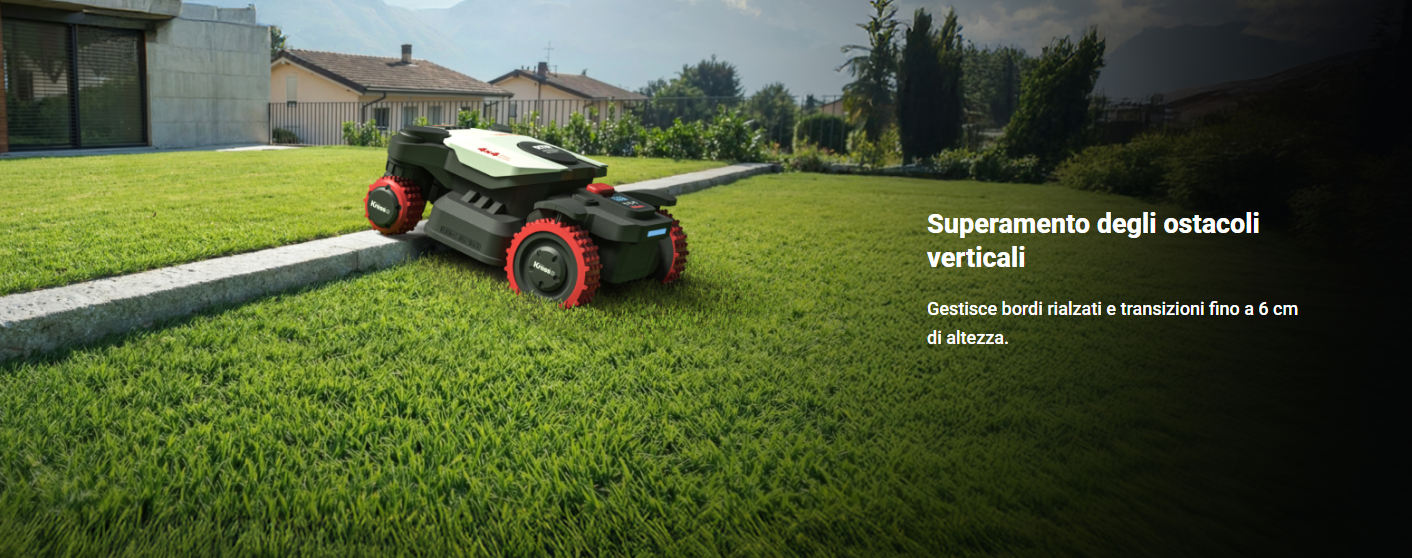 Lo sterzo anteriore permette curve strette senza danneggiare il tappeto erboso, mentre la capacità di superare ostacoli verticali fino a 6 cm consente di affrontare bordi rialzati e transizioni in totale sicurezza.